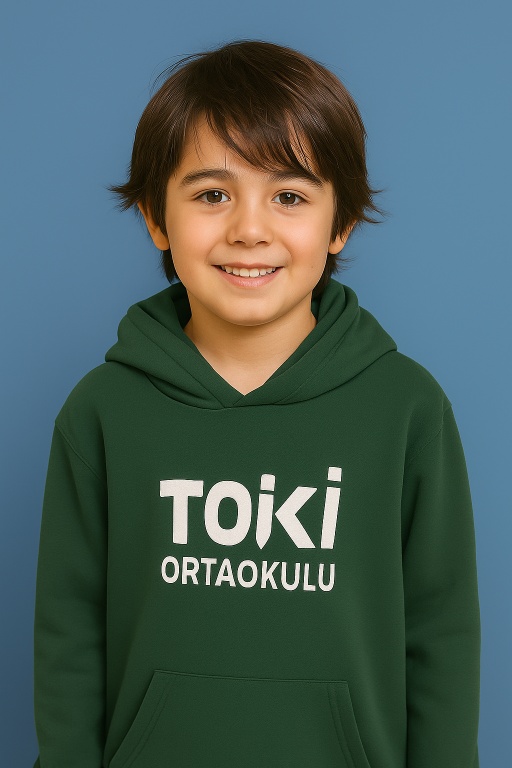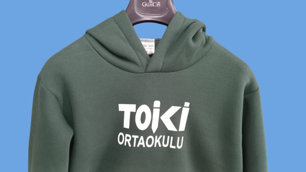 Görselde yer alan yeşil renkli uzun kol okul isimli kapüşonlu kıyafet.